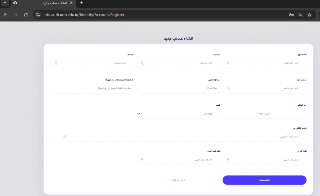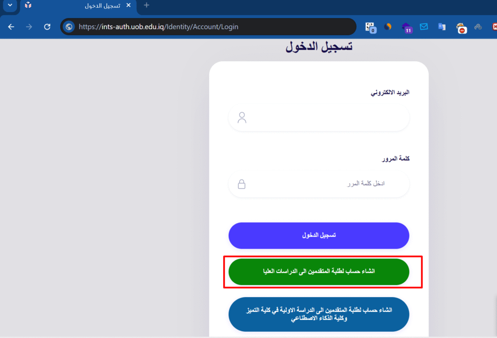 بعد الضغط على زر “ انشاء حساب للطلبة المتقدمين للدراسات العليا ” ، ستنتقل إلى صفحة تطلب منك إدخال المعلومات اللازمة لإنشاء الحساب.